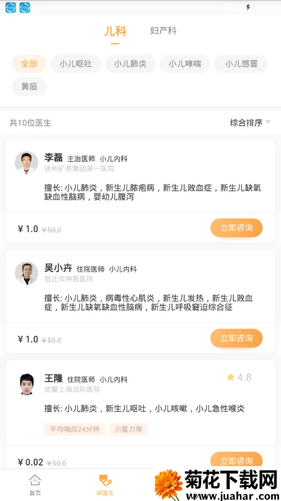 3、切换到儿科或其他科室分类,筛选对应病症医生,了解其擅长领域与咨询价格。
