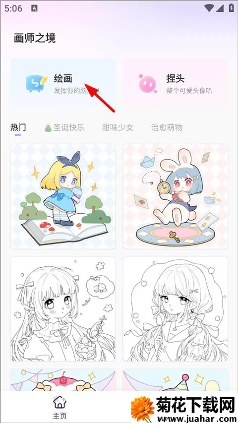 1、用户打开画师之境app,登录进入主页,主页中有各种热门、治愈、甜味素材,用户可选择喜欢的进行涂色,点击左上角绘画;
