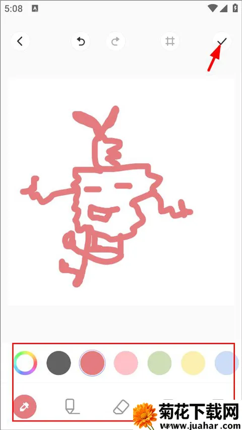 3、打开画板页面,页面下方是工具栏,用户可选择颜色、画笔进行创作,创作完场后点击右上角保存即可;