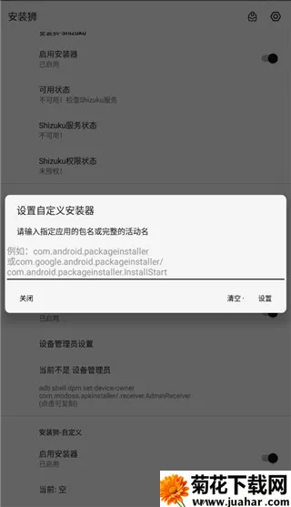 4、支持自定义安装器,输入指定应用的包名或完整活动名即可完成设置。