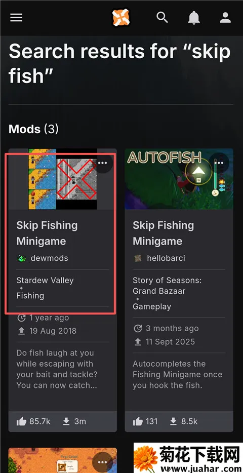 2、然后再搜索栏中搜索自己想要的mod下载,以钓鱼mod为例,搜索skip fish。