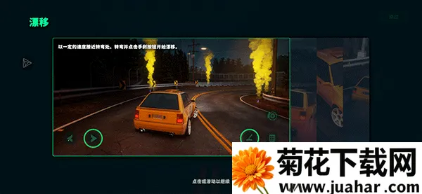3、当玩家经过玩到时可以在一定速度接近转弯处时,转弯并点击手刹按钮开始漂移