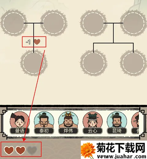 3、如果拖入的人物与圆框不不对应,会扣除血量,三格血量全部扣除即为失败,因此玩家需要小心判断。