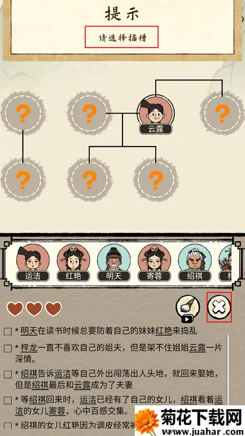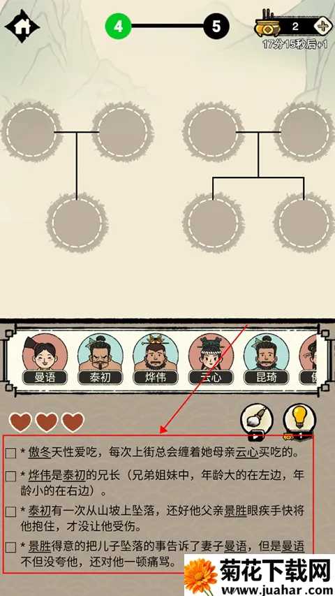 2、进入关卡后,玩家需要根据下方文字提示,将人物头像拖入上方合适圆框内,进行族谱的修缮。
